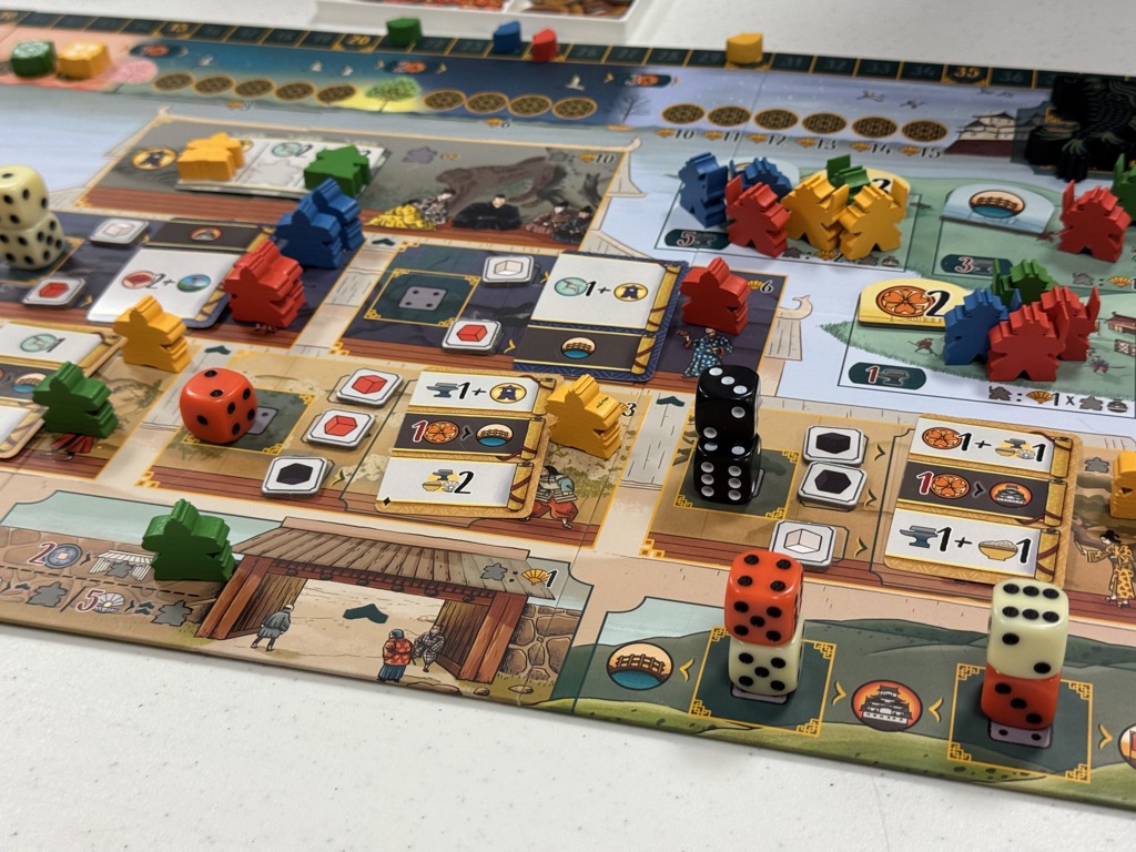 We play mostly strategy games / Eurogames. They have more interesting decisions than classic American board games, generally feature no player elimination, and may have catch-up mechanisms and little or no randomness. Our games generally are not trivia games, party games, word games, role-playing games, or long war or economic campaign games. (Some of them are long. Good ones have been creeping longer, and I would like to get back to medium-length games.)